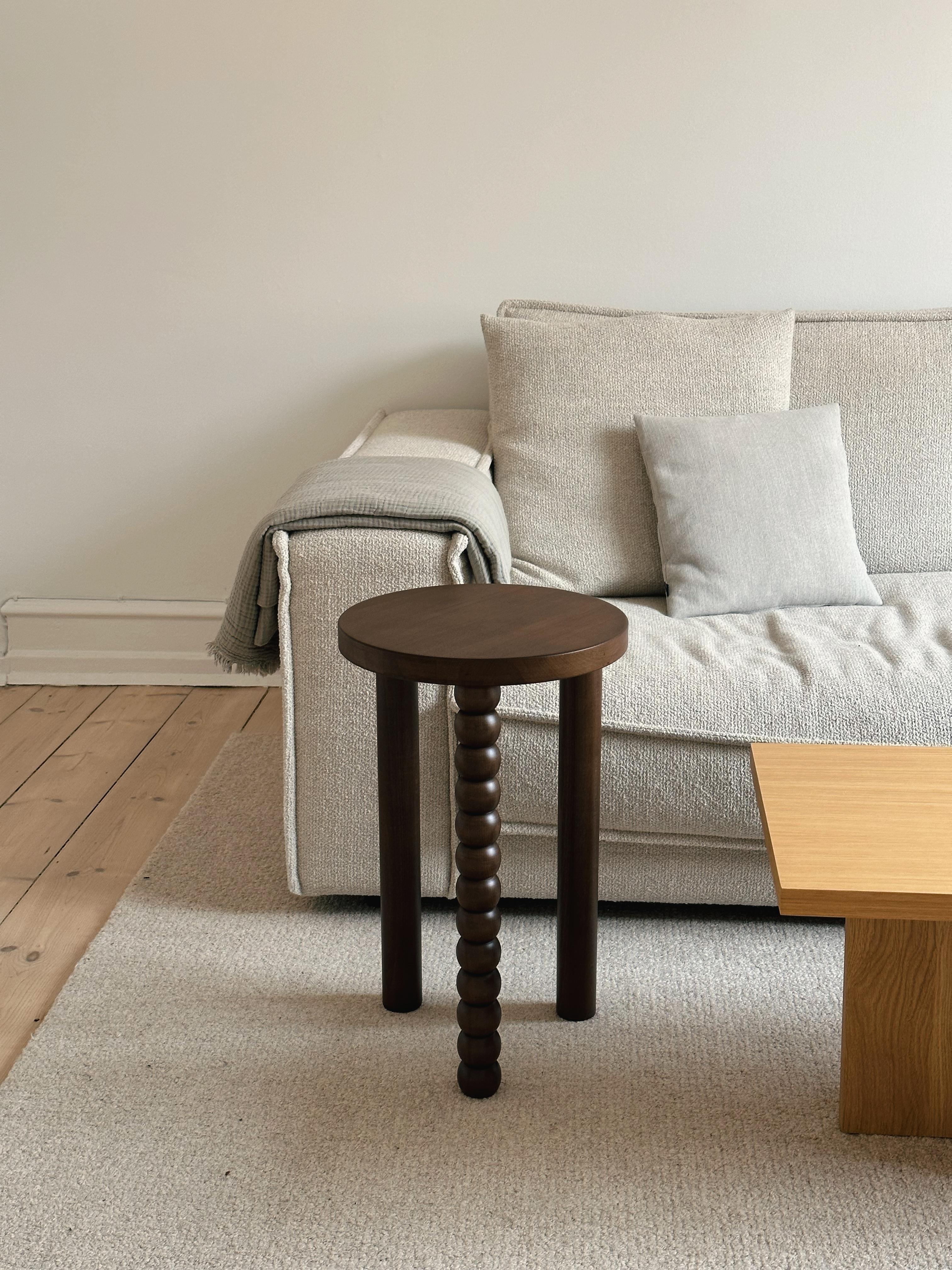 Euclidean geometry -a little sphere- is selected for the turned wood leg in order to bring an appealing look to the lower part of the side table.
